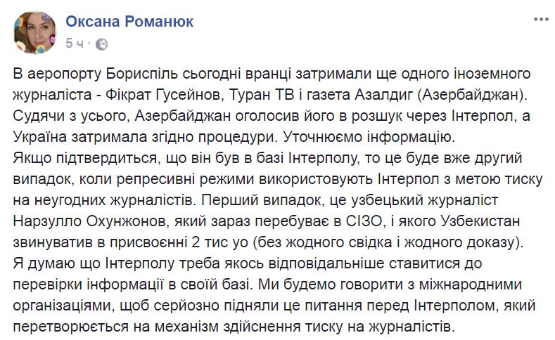 "Судя по всему, Азербайджан объявил его в розыск через Интерпол, а Украина задержала согласно процедуре. Уточняем информацию", - написала Романюк.