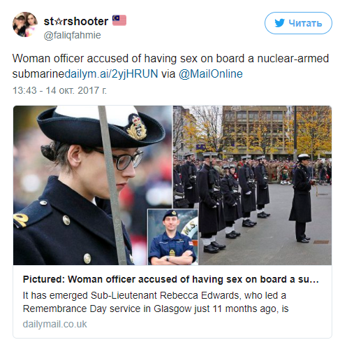 Девушка нарушила устав, вступив в интимную связь с капитаном субмарины Стюартом Армстронгом. Возмущенные сослуживцы сообщили об инциденте вышестоящему руководству.