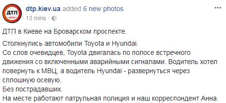 В Киеве на Броварском проспекте лоб в лоб столкнулись автомобили Toyota и Hyundai. Об этом сообщает портал dtp.kiev.ua на странице в Facebook.