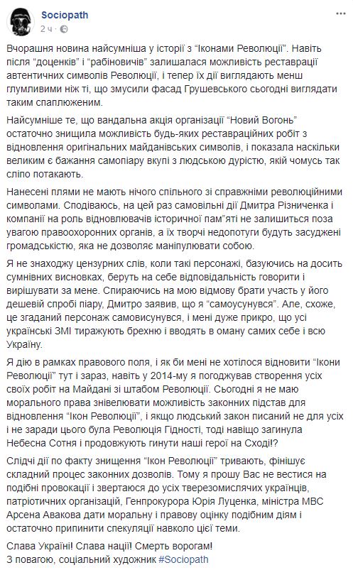 "Я действую в рамках правового поля, и как бы мне не хотелось восстановить "Иконы Революции" здесь и сейчас, даже в 2014-м я согласовал создание всех своих работ на Майдане со штабом революции", - заявил Sociopath.