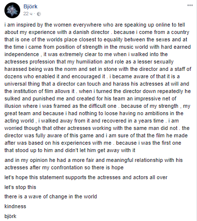 Исландская певица Бьорк заявила, что ее сексуально домогался знаменитый датский режиссер. Об этом она написала на своей странице в Facebook.