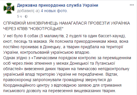 "У нее было 8 собак (5 маламутов, 2 пуделя и один бассет-хаунд), енот, песец и макака. Как объяснила пограничникам женщина, она постоянно проживает в Донецке, а животных приобрела на территории Украины, контролируемой украинскими властями", - говорится в сообщении.