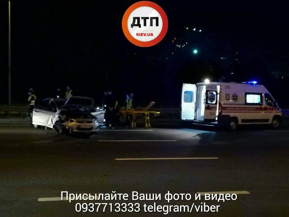 ДТП произошло на проспекте Бажана, в направлении Борисполя. Патрульная полиция преследовала автомобиль Hyundai. Уходя от погони, водитель врезался в попутный автомобиль.