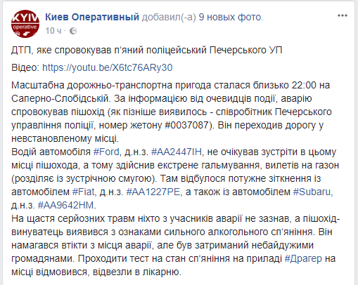 По информации очевидцев происшествия, аварию спровоцировал пешеход (как позже оказалось – сотрудник Печерского управления полиции, номер жетона 0037087). Он переходил дорогу в неустановленном месте.