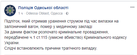В Одесской области 17-летний парень залез на вагон поезда и умер от удара током. Об этом сообщает пресс-служба областной полиции в Facebook.
