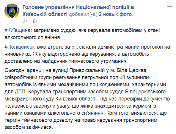 Управляла машиной судья Белоцерковского горрайонного суда Киевской области. Во время проверки документов полицейские обратили внимание на явные признаки алкогольного опьянения у женщины, передает на Facebook пресс-служба ГУ полиции Киевской области.