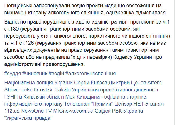 Относительно правонарушительницы составлены административные протоколы по ч.1 ст.130 ("Управление транспортными средствами лицами, находящимися в состоянии алкогольного, наркотического или другого опьянения") и ч.1 ст.126 ("Управление транспортным средством лицом, не имеющим соответствующих документов на право управления таким транспортным средством или не предъявившим их для проверки") Кодекса Украины об административных правонарушениях.