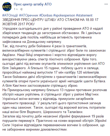 "Около 13.00 противник начал обстрел украинских укреплений из стрелкового оружия в районе Марьинки. Украинские воины огнем в ответ вынудили боевиков прекратить провокации. В результате этого противостояния погиб один украинский военный", - говориться в сообщении.