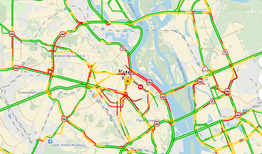 К 19:00 вечера среды, 18 октября пробки в Киеве достигли 9 баллов по шкале всем известного, но все еще официально запрещенного интернет-сервиса Яндекс.Пробки.