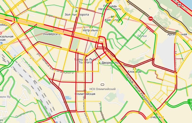 Трудно проехать по улицам Большая Васильковская, Антоновича, Льва Толстого, Владимирской, Бассейной и Мечникова.