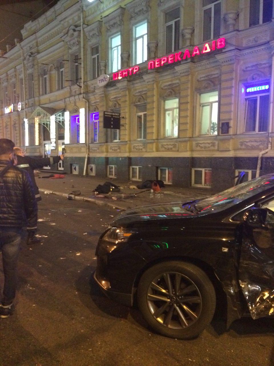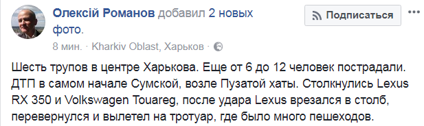 "Шесть трупов в центре Харькова. Еще от 6 до 12 человек пострадали. ДТП в самом начале Сумской, возле Пузатой хаты. Столкнулись Lexus RX 350 и Volkswagen Touareg, после удара Lexus врезался в столб, перевернулся и вылетел на тротуар, где было много пешеходов", - написал в Facebook юрист Алексей Романов.