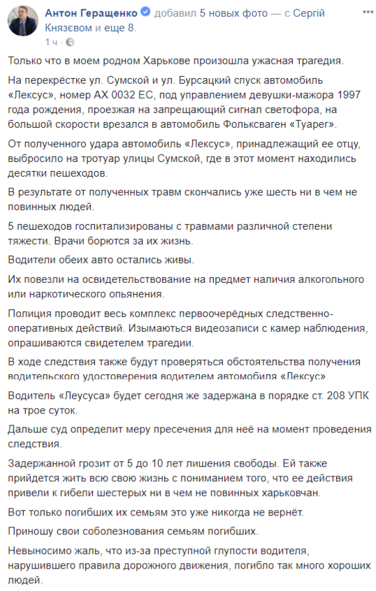 "От полученного удара автомобиль «Лексус», принадлежащий ее отцу, выбросило на тротуар улицы Сумской, где в этот момент находились десятки пешеходов. В результате от полученных травм скончались уже шесть ни в чем не повинных людей. 5 пешеходов госпитализированы с травмами различной степени тяжести. Врачи борются за их жизнь. Водители обеих авто остались живы. Их повезли на освидетельствование на предмет наличия алкогольного или наркотического опьянения", пишет Геращенко.