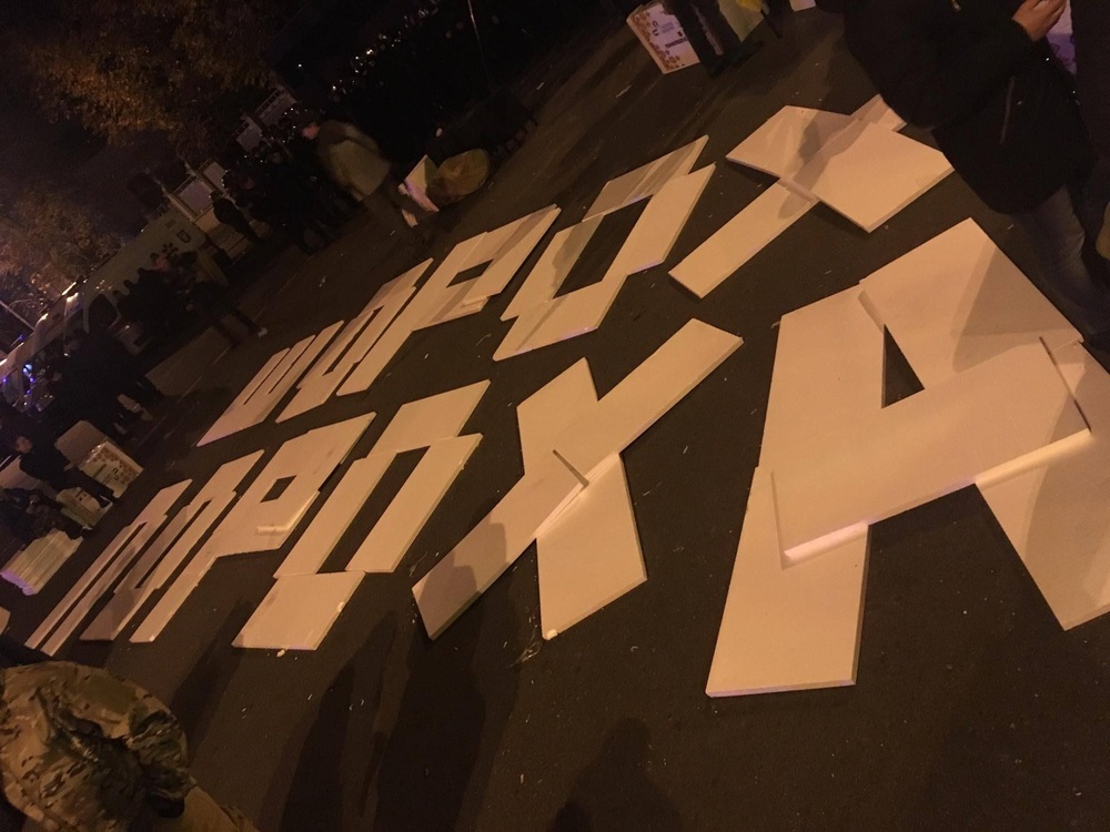 22.08 - МихоМайдановцы развлекаются в ожидании пересменки и решения полиции. "Шорох Пороха", - такая надпись выложена из утеплителя на асфальте.