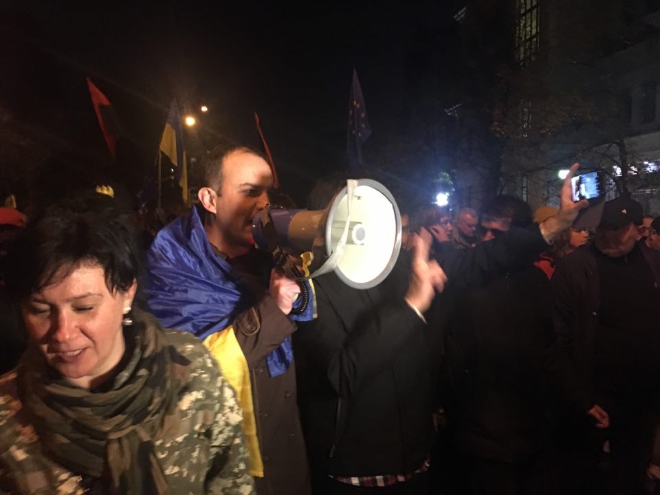 19.17 Депутат Егор Соболев предлагает всем митингующим идти к Администрации президента и требовать от Порошенко законопроект об антикоррупционном суде.