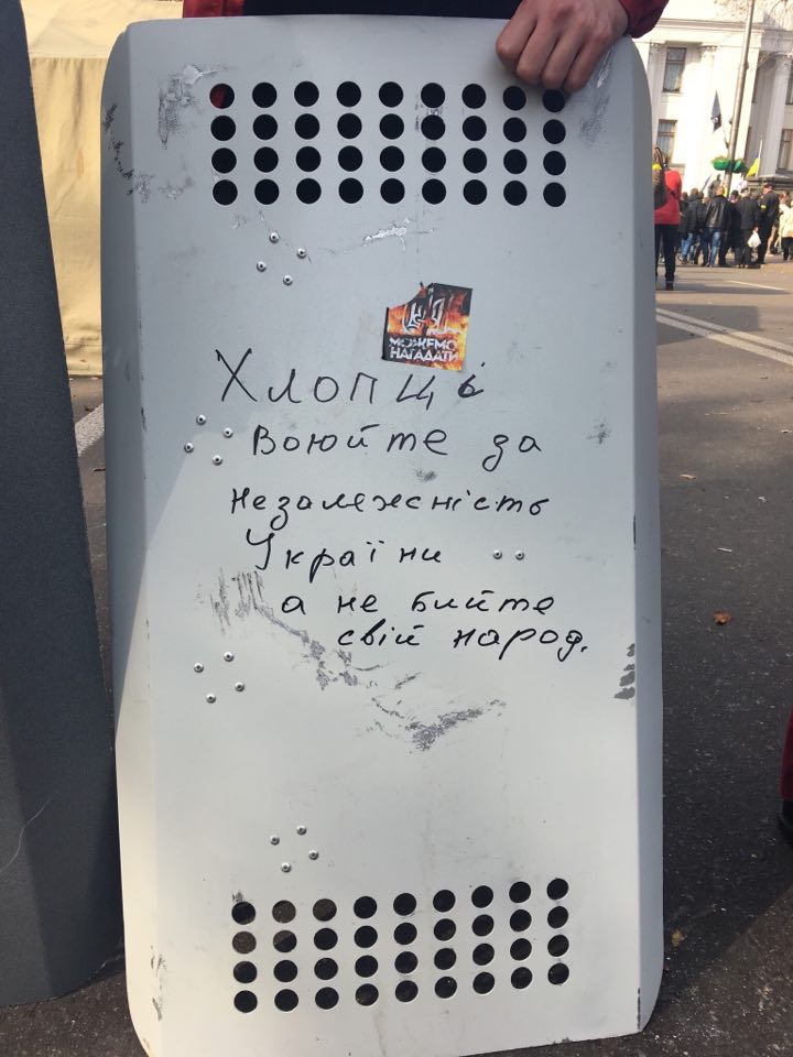 Один из них представился офицером батальона "Донбасс" с позывным Катана, родом с Прикарпатья. Он заявил, что ветераны АТО берут всю ответственность на себя. Требования протестующих - предателей Украины на нары, забрать власть у олигархов и равный закон для всех.