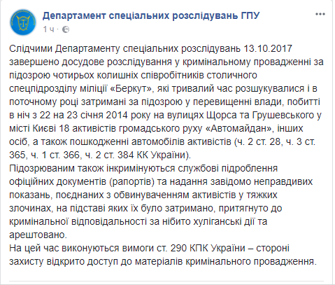 Департамент специальных расследований Генпрокуратуры завершил досудебное расследование дела об избиении активистов "Автомайдана" четырьмя бывшими сотрудниками "Беркута". Об этом сообщает пресс-служба департамента в Facebook.