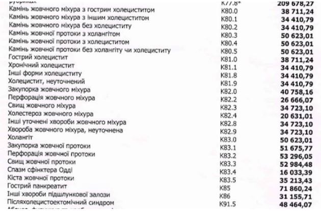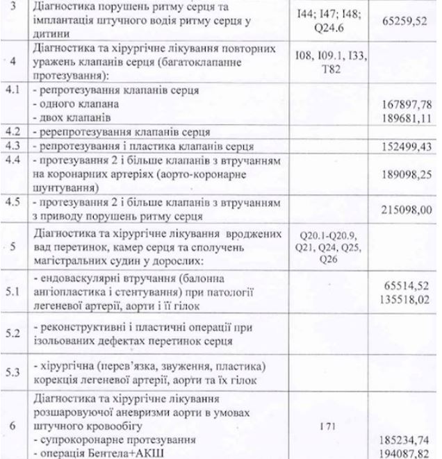 Например, диагностика нарушения ритма сердца у ребенка будет стоит 65 тысяч гривен. Репротезирование двух клапанов сердца - почти 190 тысяч гривен. Аневризма сердца - почти 154 тысячи гривен. Стеноз - более 163 тысяч. Шунтирование аорты - 130 тысяч гривен. Коронарный тромбоз - 103 тысячи. Лечение цирроза печени - 111 тысяч.