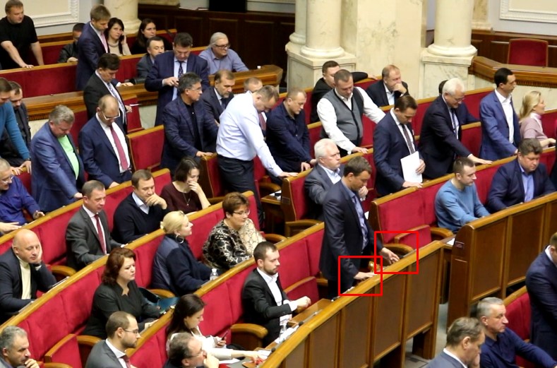 Кроме того, кнопкадавили и депутаты от "Народного фронта". На фото видно, как заместитель главы фракции НФ Андрей Иванчук голосует на трех местах.