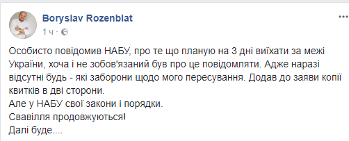 "Лично сообщил НАБУ, о том, что планирую на 3 дня выехать за пределы Украины, хотя и не обязан был об этом сообщать. Ведь в настоящее время отсутствуют какие-либо запреты относительно моего передвижения", - подчеркнул Розенблат.