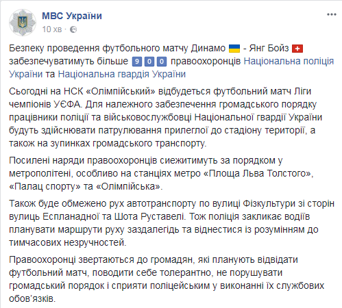 "Безопасность проведения футбольного матча "Динамо" и "ЯНГ Бойз" будут обеспечивать более 900 правоохранителей из Национальной полиции Украины и Национальной гвардии Украины.