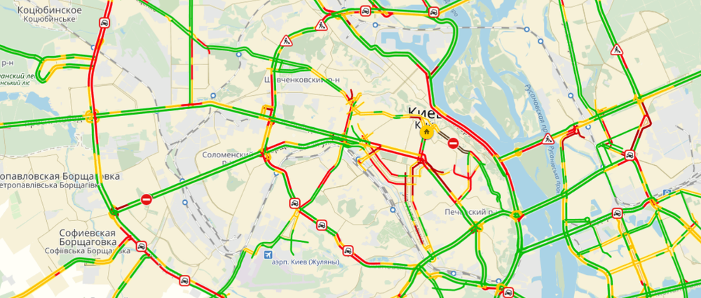 На Правобережье дорожные заторы традиционно образовались на бульваре Льва Толского, бульваре Тараса Шевченко, а также на ул. Пушкинской, Большой Васильковской, Владимирской, Симона Петлюры, Короленковской, Шелковичной, части бульвара Леси Украинки, а также на Набережном шоссе.
