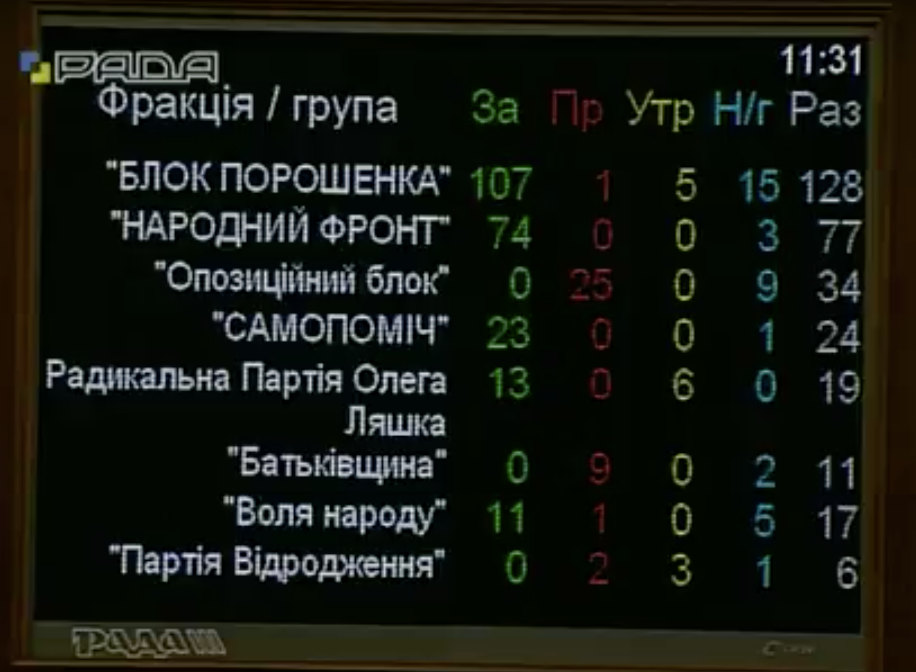 Об этом свидетельствуют результаты поименного голосования на официальном сайте Верховной Рады. В частности, за проект голоса "за" отдали 107 из 138 представителей БПП, 74 из 81 членов "Народного фронта", 23 из 25 депутатов от "Самопомощи", 13 из 20 членов Радикальной партии, 12 внефракционных депутатов, 11 от группы "Воля народу".