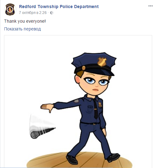 Департамент Редфорда обратился к подписчикам в Facebook с просьбой помочь поймать преступника. Пользователи поддержали спор и набрали нужное количество репостов меньше чем за час. За девять дней запись перепостили около 4,5 тысяч раз.