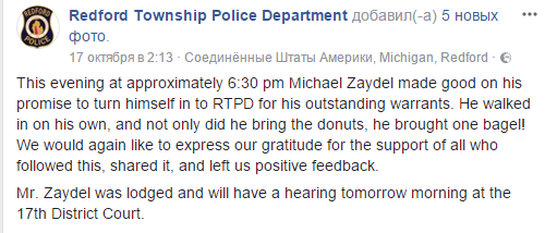 В городе Редфорд (штат Мичиган) американец Майкл Зайдел постоянно троллил полицию в Facebook. У полиции  был ордер на арест Зайдела за два преступления: его обвинили в попытке нападения на человека и нетрезвом вождении.