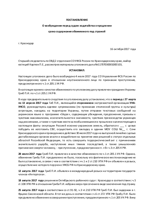 ""В период с 27 марта до 13 апреля 2017 Гриб П. И., который является сторонником экстремисткой организации УНА-УНСО, руководствуясь идеями супремасизма (по признакам этнической группы и культуры) сегрегации, находясь на территории Украины, путем передачи текстовых сообщений на украинском языке в программе "Skype", содержащие убеждению, предложения, призывы к чувствам максимализма, исключительности и значимости, чувством превосходства Украинский над русскими, а также к чувствам мести за якобы бывшие и имеющиеся факты оккупации Россией исконно украинских зе мель, обратился к ___ с целью побудить ее изготовить СВП, осуществить его закладку в здании МОУ СОШ №__ м. Сочи Краснодарского края и приведения в действие 30 июля 2017 на выпускной линейке с целью дестабилизации органов власти и влияния на принятие ими решений о статусе отдельных областей Российской Федерации, то есть осуществить террористический акт с причинением значительного ущерба, наступления иных тяжких последствий, а также умышленного причинения смерти человеку ", - говорится в постановлении.