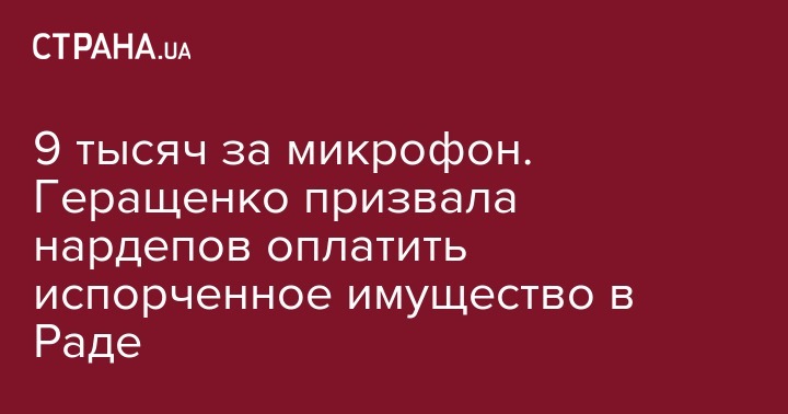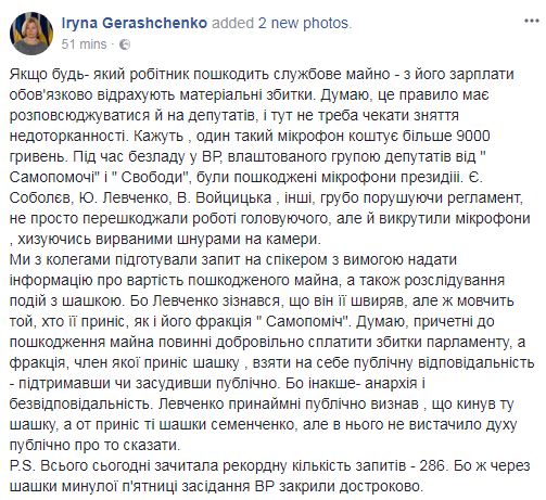 Первый заместитель главы Рады Ирина Геращенко заявила, что народные депутаты должны оплатить убытки за сломанные микрофоны по 9 тыс. грн. Об этом она написала на своей странице в Facebook.