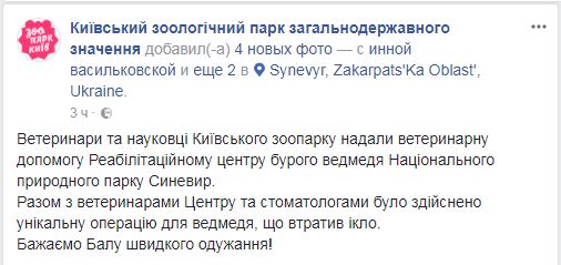 "Ветеринары и ученые Киевского зоопарка оказали ветеринарную помощь Реабилитационному центру бурого медведя Национального природного парка Синевир. Вместе с ветеринарами Центра и стоматологами была совершена уникальная операция для медведя, который потерял клык. Желаем Балу скорейшего выздоровления!", - говорится в сообщении.