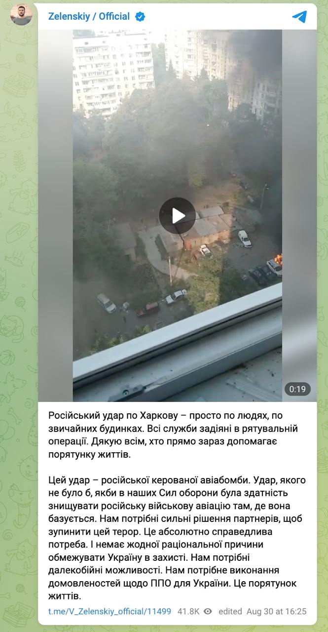 "Удар, которого не было бы, если бы у наших сил обороны была способность уничтожать российскую военную авиацию там, где она базируется. Нам нужны сильные решения партнеров, чтобы остановить этот террор. Это совершенно справедливая потребность. И нет никакой рациональной причины ограничивать Украину в защите", - пишет президент.