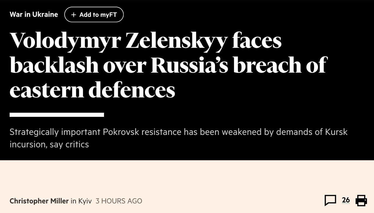 10.02 В Financial Times вышла статья с критикой Зеленского из-за решения отправить войска наступать под Курском, а не оборонять Покровск.