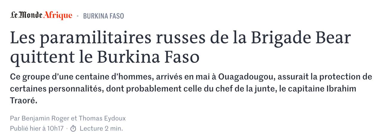 11.40 Россия перебрасывает в Курскую область ЧВК "Медведи", которая с мая воевала в Буркина-Фасо на стороне хунты капитана Ибрагима Траоре, сообщает Le Monde.