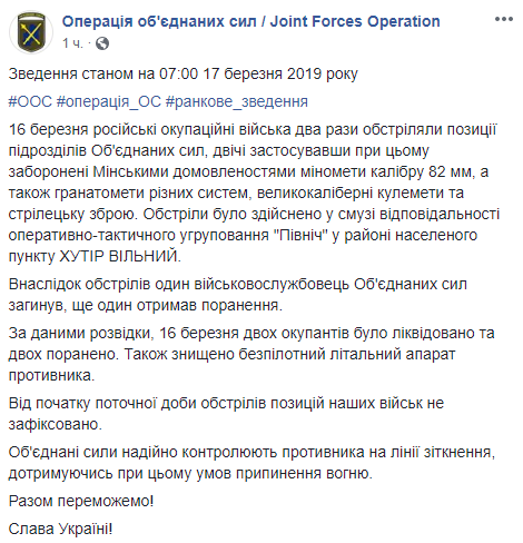 За минувшие сутки, 16 марта, на Донбассе под обстрелами боевиков погиб один украинский военный, еще один получил ранения. Об этом в Facebook сообщает пресс-центр ООС.
