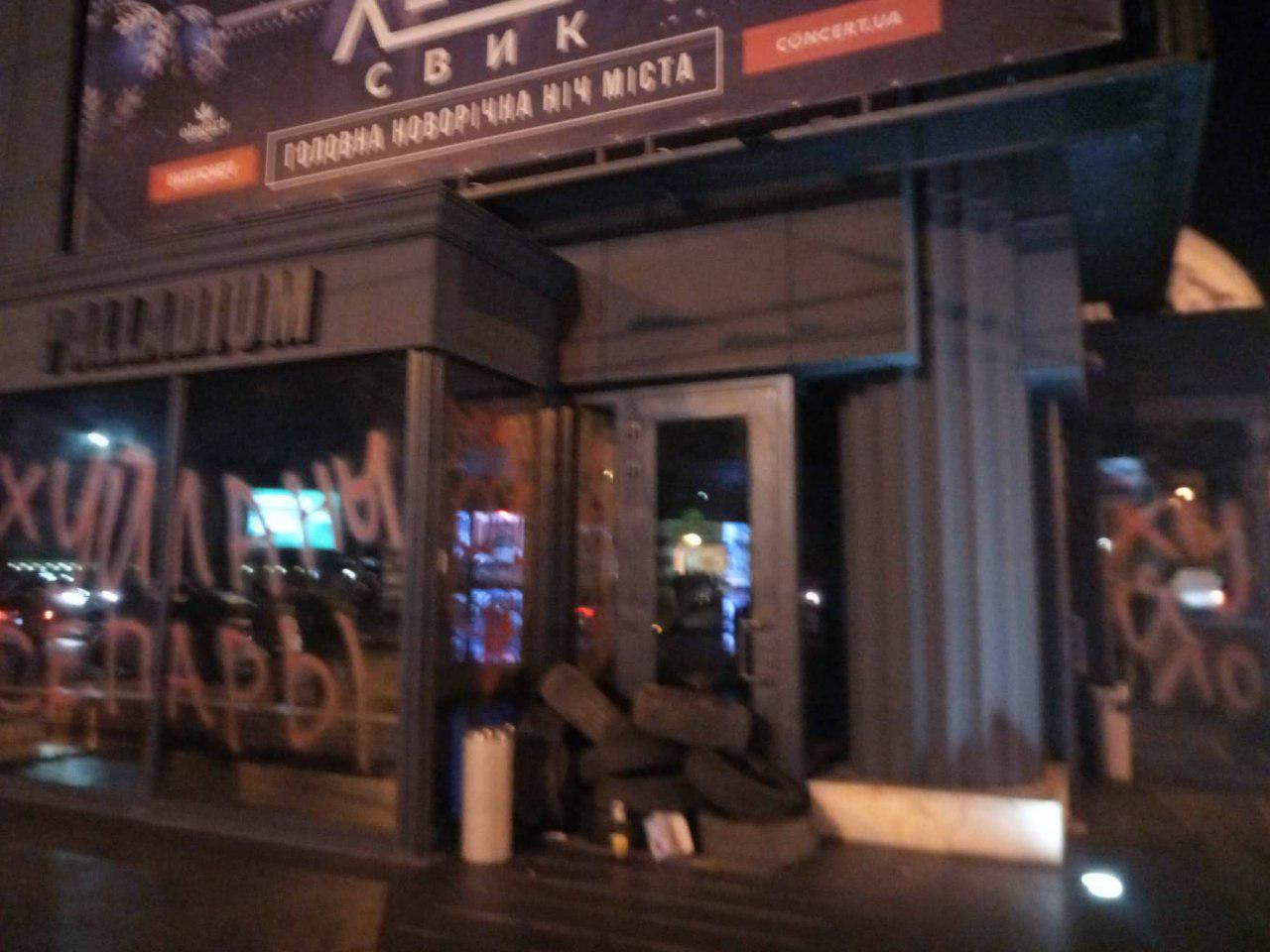 Также они принесли под здание клуба автопокрышки и написали на окнах заведения "ху@ланы, сепары" и "сепар-клуб закрыт".