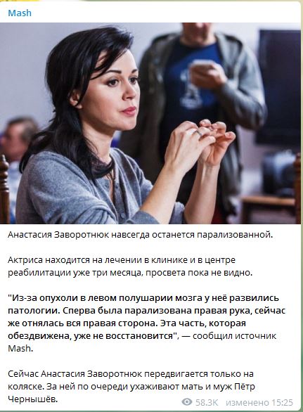 "Из-за опухоли в левом полушарии мозга у нее развились патологии. Сперва была парализована правая рука, сейчас же отнялась вся правая сторона. Эта часть, которая обездвижена, уже не восстановится", - сообщил источник Telegram-канала Mash.