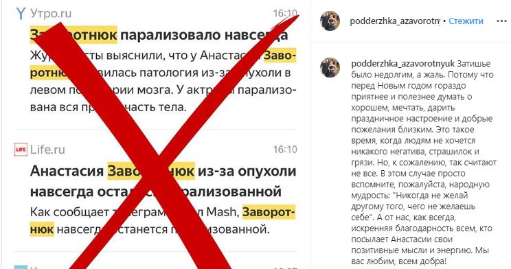 Представители актрисы Анастасии Заворотнюк прокомментировали публикации о том, что ее якобы парализовало. Об этом они заявили в Instagram-аккаунте, созданном с целью поддержки звезды.