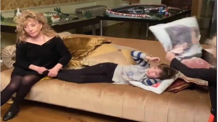 В ролике Гарри возлежит на софе в окружении подушек. Алла Борисовна разминает ему ступни, а Лиза обмахивает брата импровизированным опахалом - небольшой подушкой. Причем мальчик командует, чтобы сестра делала это побыстрее.
