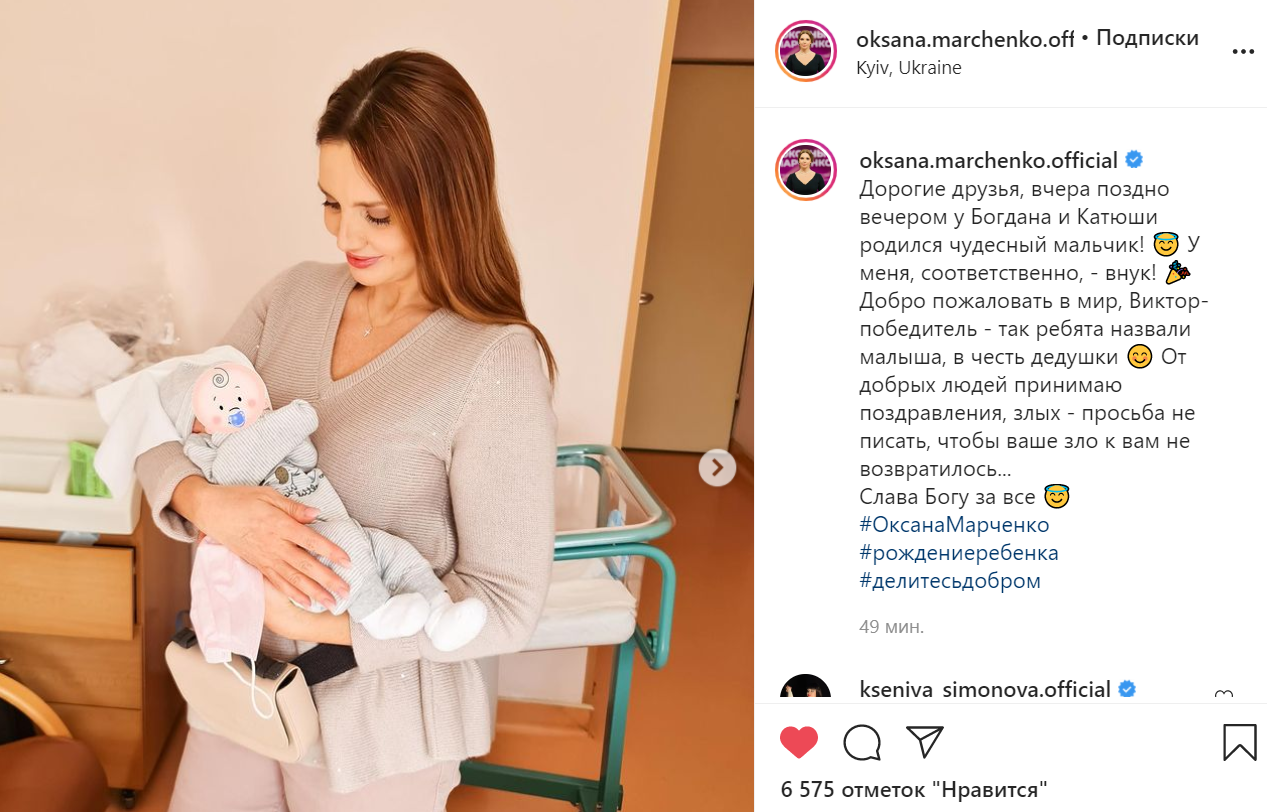 "У Богдана и Катюши родился чудесный мальчик! У меня, соответственно, - внук! Добро пожаловать в мир, Виктор-победитель - так ребята назвали малыша, в честь дедушки. От добрых людей принимаю поздравления, злых - просьба не писать, чтобы ваше зло к вам не возвратилось... Слава Богу за все", - написала Оксана Марченко.