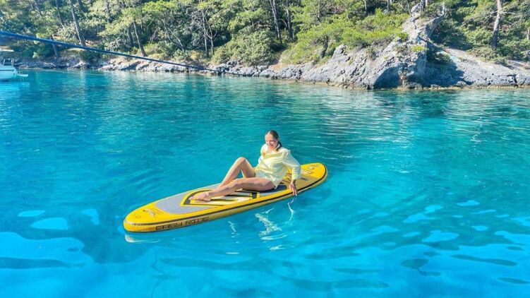На снимках, опубликованных в соцсети, Катя Осадчая позирует на сап-борде посреди лазурного водоема. На ней  черный купальник и желтая рубашка.
