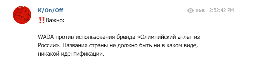 "WADA против использования бренда "Олимпийский атлет из России". Названия страны не должно быть ни в каком виде, никакой идентификации", – говорится в опубликованном сообщении.