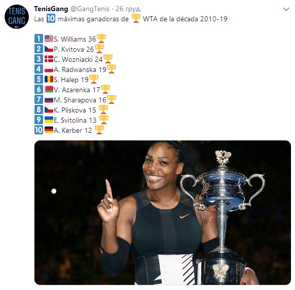 Лидером списка стала американская спортсменка Серена Уильямс, на счету которой 36 трофеев. На втором месте – чешка Петра Квитова (26 трофеев). Закрывает тройку лидеров представительница Дании Каролин Возняцки (24 трофея).