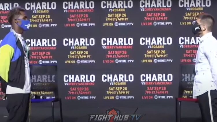 Из-за коронавируса в необычном формате прошла дуэль взглядов между украинским боксером Сергеем Деревянченко и чемпионом мира в среднем весе по версии WBC Джермаллом Чарло, которые встретятся на ринге ночь с 26 на 27 сентября на арене "Mohegan Sun Arena" в Анкасвилле, США.