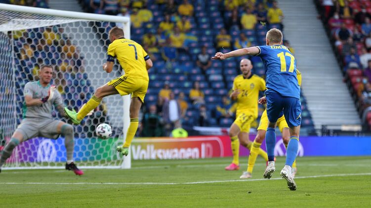 Защитник сборной Украины Александр Зинченко открывает счет в поединке с командой Швеции, фото: twitter.com/euro2020