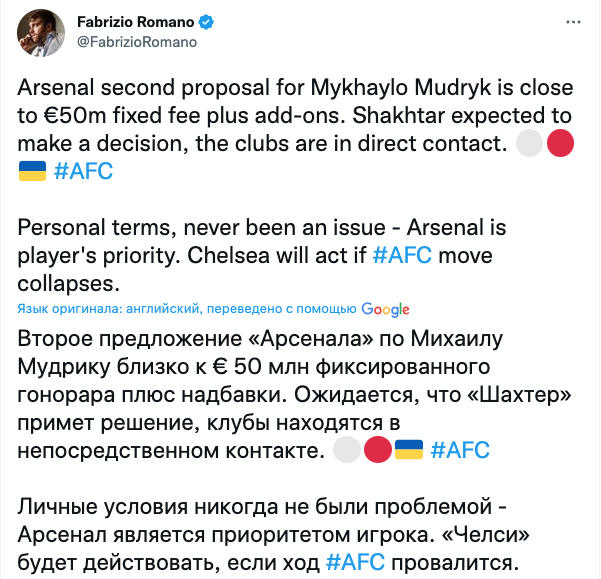 Авторитетный футбольный инсайдер Фабрицио Романо сообщает, что лондонский "Арсенал" сделал уже два предложения по трансферу украинского полузащитника Михаила Мудрика.