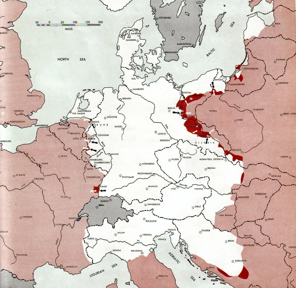 Якщо подивитися на карту фронтів Європи лютого 1945 року, ми побачимо, що бойові дії практично не стосуються більшої частини Німеччини – вони йдуть лише у східній частині країни (щоправда, неподалік Берліна) і до приєднаних до Третього Рейху в 1940 Ельзасі та Лотарингії. Вся решта "метрополія" страждає лише від бомбардувань (хоча вони й посилюються).