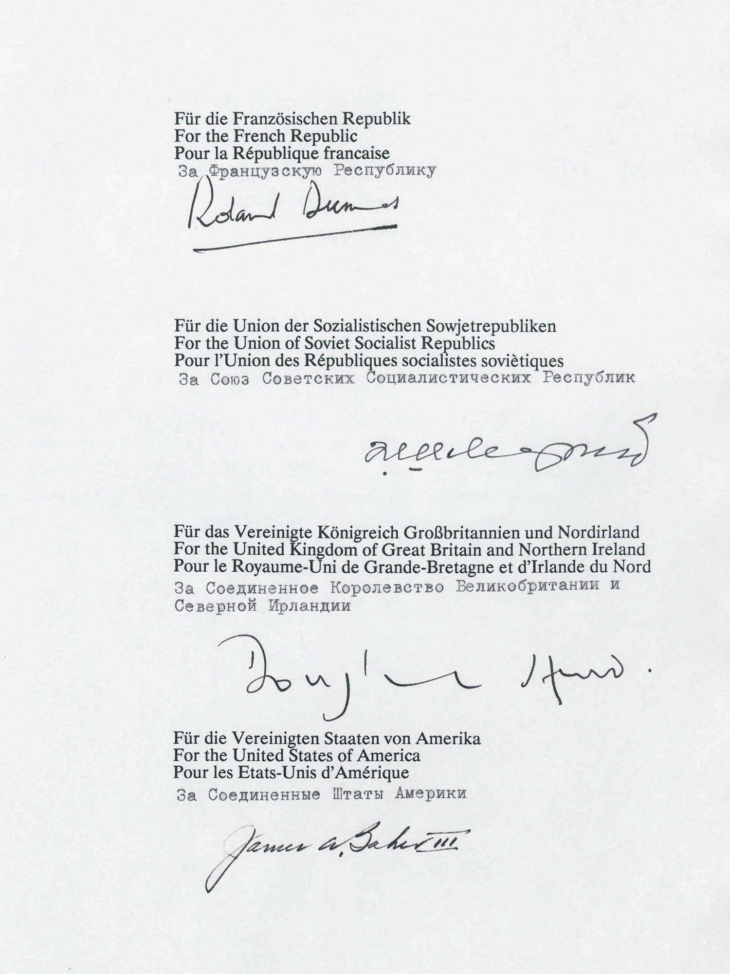 2 жовтня 1990 року у Нью-Йорку представники США, СРСР, Франції та Британії виступили із заявою про зупинення своїх прав та обов'язків щодо Берліна та Німеччини в цілому з моменту об'єднання ФРН та НДР до набрання чинності договором "2+4".