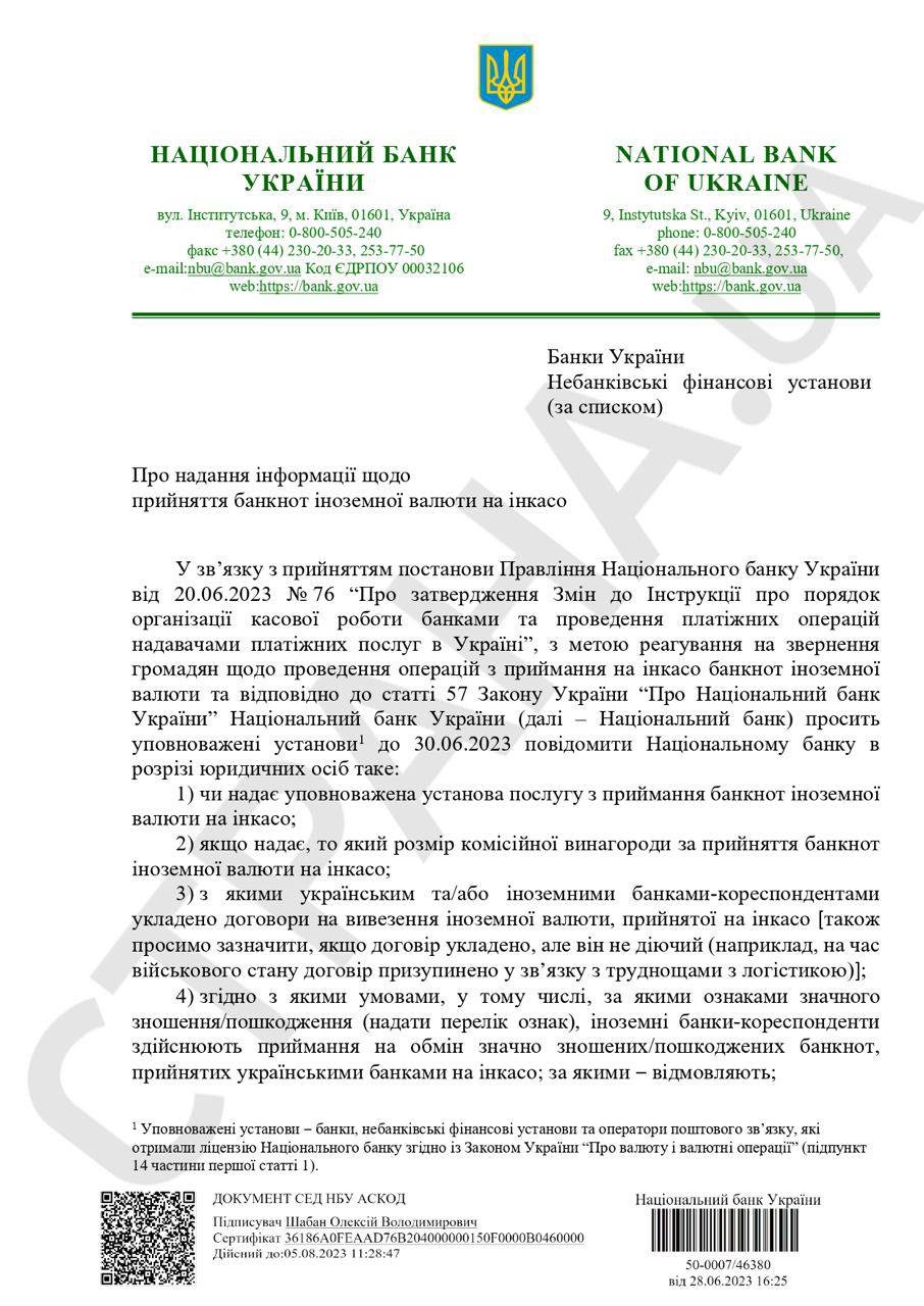 Але банки та фінкомпанії зробили "хід конем" і почали встановлювати за інкасо величезні комісії, які сягали 30% суми, а в деяких випадках навіть 50%, при тому, що до війни стандартний цінник був на рівні 10%. А за тих умов, коли тариф був не дуже високим, банки приймали зношену валюту за заниженим курсом - за офіційним НБУ у розмірі 36,6 грн/$. Однак за це НБУ ще нікого не карав. Але, судячи з підготовленого листа, можливо, він уже готує деякі заходи проти банків, які різко піднімають комісії за прийом зношених купюр.