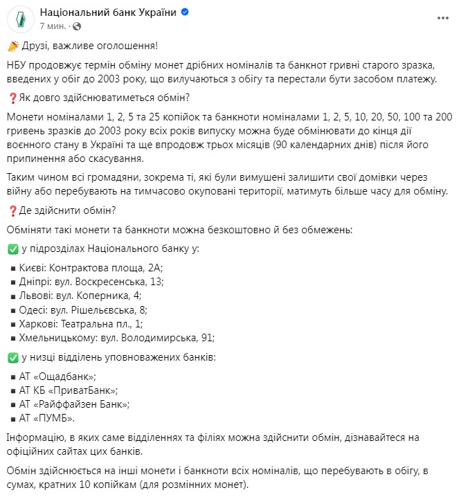 Монети номіналами 1, 2, 5 та 25 копійок та банкноти номіналами 1, 2, 5, 10, 20, 50, 100 та 200 гривень зразка до 2003 року всіх років випуску можна буде обмінювати до кінця дії військового стану в Україні та ще протягом трьох місяців (90 календарних днів) після його припинення.